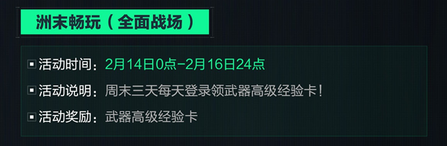 活动说明: 周末三天每天登录领武器高级经验卡。