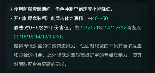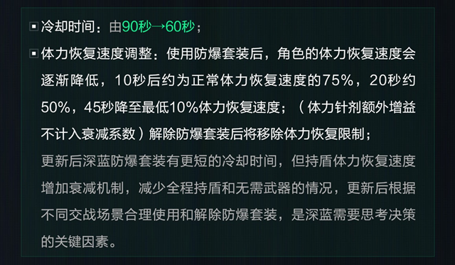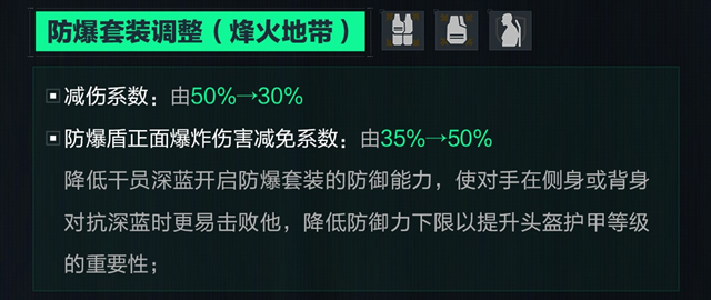 首先,针对深蓝的核心装备——防爆套装进行了调整。具体改动包括减伤系数从50%降至30%,同时防爆盾正面爆炸伤害减免系数则从35%提升至50%。