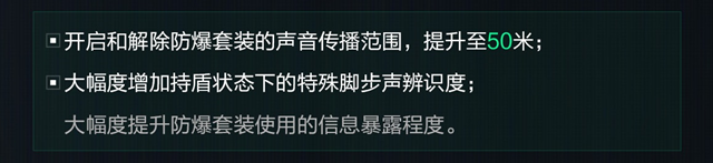其次,为了增加对抗深蓝时的信息透明度,更新后的防爆套装开启和解除的声音传播范围扩大到了50米,且持盾状态下的特殊脚步声辨识度显著提高。另外,使用防爆套装期间的角色冲刺奔跑速度有所降低,而开启防爆套装后的冲刺盾击体力消耗也由原来的40上调至50。这些改变有助于减少深蓝快速突进的能力,给予对手更多的反应时间和拉扯空间。