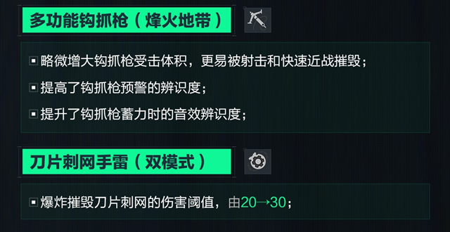 最后,多功能钩抓枪和刀片刺网手雷也受到了影响。前者受击体积略微增大,更容易被射击和近战摧毁;后者爆炸摧毁所需的伤害阈值从20提升到了30。这两项改动共同作用,降低了深蓝在战场上的不可预测性和突然袭击的效果。