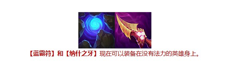 【蓝霸符】和【纳什之牙】现在可以装备在没有法力的英雄身上。