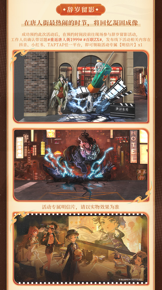带话题#重返唐人街1999##百联ZX#,在抖音、小红书、TAPTAP任一平台发布线下活动相关内容,即可领取活动专属【明信片】X1。