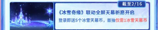活动内容:冰雪奇缘联动全屏天幕祈愿活动正式开启,首抽仅需【1冰雪天幕币】,超值机会不容错过!