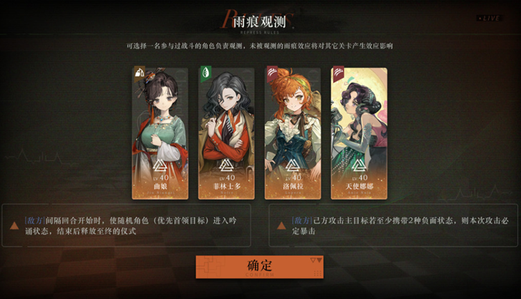 - 玩家可选择一名参与过战斗的角色负责观测,被观测的雨痕效应将不会影响其他关卡。