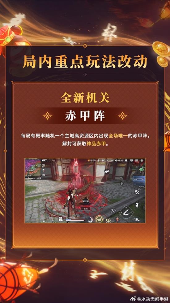 全新机关赤甲阵:每局有概率随机一个主城高资源区内出现全场唯一的赤甲阵,解封可获取神品赤甲。