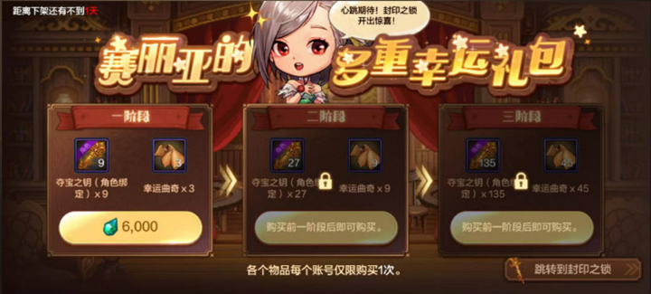 - 赛丽亚多重幸运礼包:适合需要大量夺宝之钥的玩家,尤其是计划开启封印之锁获取武器装扮的勇士,建议优先购买3阶段礼包,性价比更高。