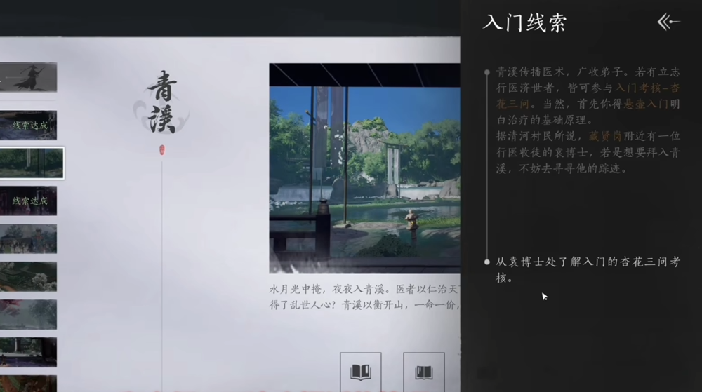 入门青溪的第一步是前往藏贤岗鹿谭东北医馆处,找到袁博士并与他交谈,参与任务“杏花三问”。如果袁博士不在,你可以与童子谈话,他会指引你前往抱山湖西北方河边的悬崖处找到袁博士。