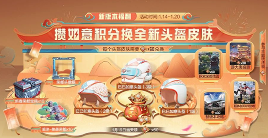 1月14日-1月20日,完成每日任务(每天最多领20如意积分)以及参与探索荣都地图、游大唐盛景、新版本攻略、超体新导师登场等4个活动获得130如意积分,可兑换全套头盔皮肤、荣都头像框、新春荣都宝箱、绝美荣都喷涂等福利。