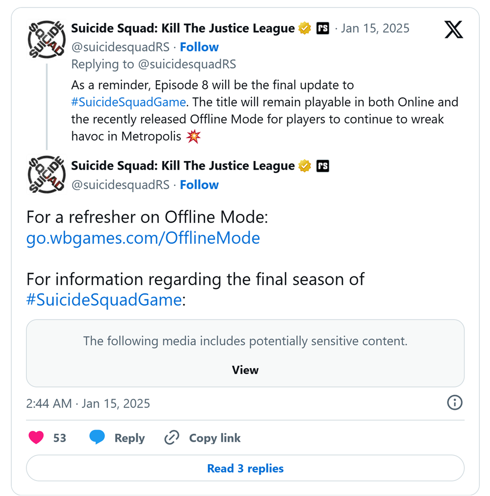 尽管第4季第8集标志着与布莱尼亚克的最终决战,但Rocksteady强调,所有在线功能将继续可用,玩家仍可与朋友享受合作模式,以及之前所有季节/剧集的内容。