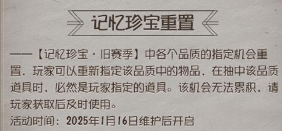 活动内容:【记忆珍宝·旧赛季】中各个品质的指定机会重置,玩家可以重新指定该品质中的物品,在抽中该品质道具时,必然是玩家指定的道具。该机会无法累积,请玩家获取后及时使用。