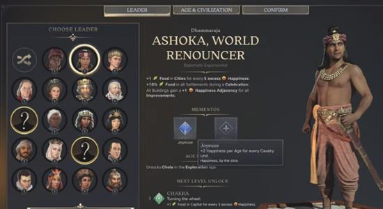 值得注意的是,虽然通过升级特定领袖路径所获得的纪念物通常与该领袖的内核能力有天然的协同效果,但你也能将纪念物装备给任何领袖。这代表即使你经由查理曼大帝获得了咎瓦尤斯纪念物,你依然可以使用阿育王开始新游戏,并替他装备这把法兰克皇帝的传奇金柄佩剑。这可让咎瓦尤斯纪念物「因每个骑兵单位而增加幸福感」的效果与阿育王本身的「法王」领袖能力完美结合,并通过满溢的幸福感获得额外食物!