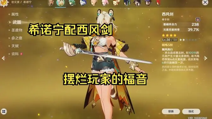 如果你的队伍配置是希诺宁搭配茜特拉莉共同辅助前台主C,那么建议更换希诺宁的武器以及茜特拉莉的圣遗物。例如,将希诺宁的武器换成西风剑,这样可以提升其充能效率,从而降低茜特拉莉对充能效率的要求。茜特拉莉则可以将武器更换为祭礼残章,圣遗物改用教官套装。这样一来,希诺宁和茜特拉莉既能同处一个阵容,又能各自适应其他阵容,无需后续频繁更换圣遗物。
