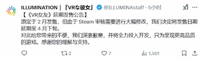 “原定于2月发售,但由于Steam审核需要进行大幅修改,我们决定将发售日期延期至4月下旬。