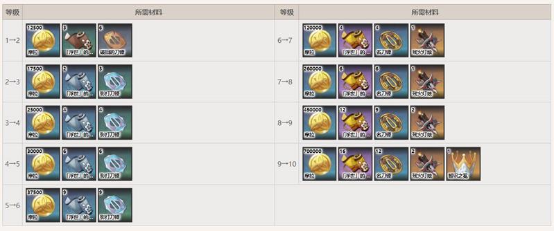 - 8级:浮世的哲学6、名刀镡6、残火灯烛*1、260000摩拉