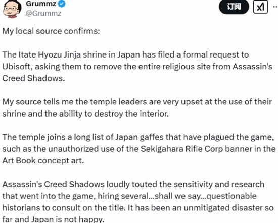 《刺客信条:影》再次陷入风波。据暴雪前制作人 Grummz透露,日本板手出水神社已向育碧提交正式申请,要求将整个宗教场所从游戏中移除。