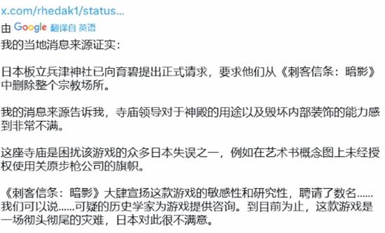 神社负责人对游戏擅自使用其宗教建筑,并允许玩家在游戏中破坏内部场景的设定表达了强烈不满。这一行为被视为对日本文化和宗教的不尊重,甚至被指责为亵渎。此前,育碧曾声称游戏经过严谨的历史文化考据,但此次事件引发了日本社会的集体抗议。