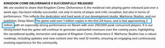 天国拯救2自发售以来,优秀的品质与内容就吸引了不少玩家的关注,游戏的销售量也不断提高,近日已到达200万层次!对此游戏发行商也不吝赞美之词,大为震喜。我们来看看。