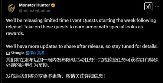 以上就是怪物猎人:荒野承诺发售后一周内推出限时活动的全部内容了,更多游戏资讯,攻略内容敬请关注切游网,您的支持是我们努力的动力!