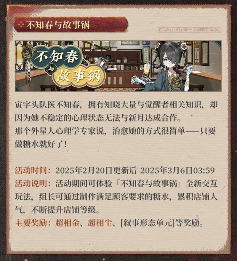 - 活动说明:活动期间可体验不知春与故事锅全新交互玩法,组长可通过制作满足顾客要求的糖水,累积店铺人气,不断提升店铺等级。