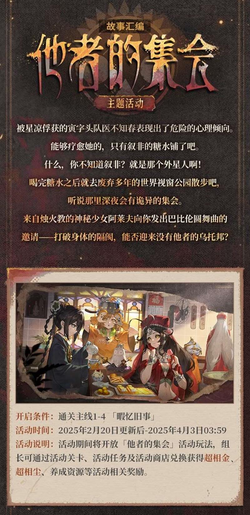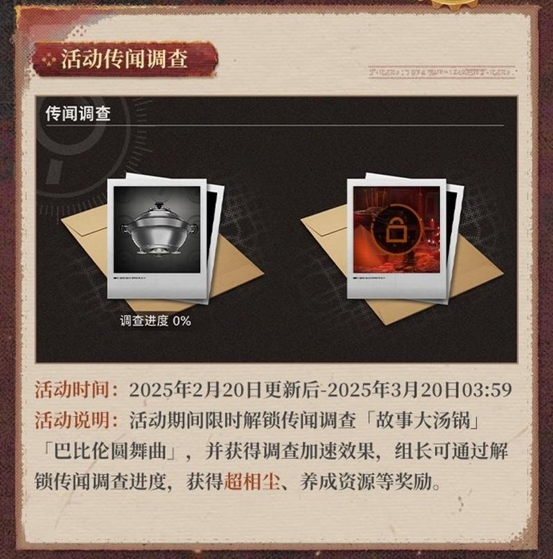 - 活动说明:活动期间限时解锁传闻调查「故事大汤锅」「巴比伦圆舞曲」,并获得调查加速效果,组长可通过解锁传闻调查进度,获得超相尘、养成资源等奖励。