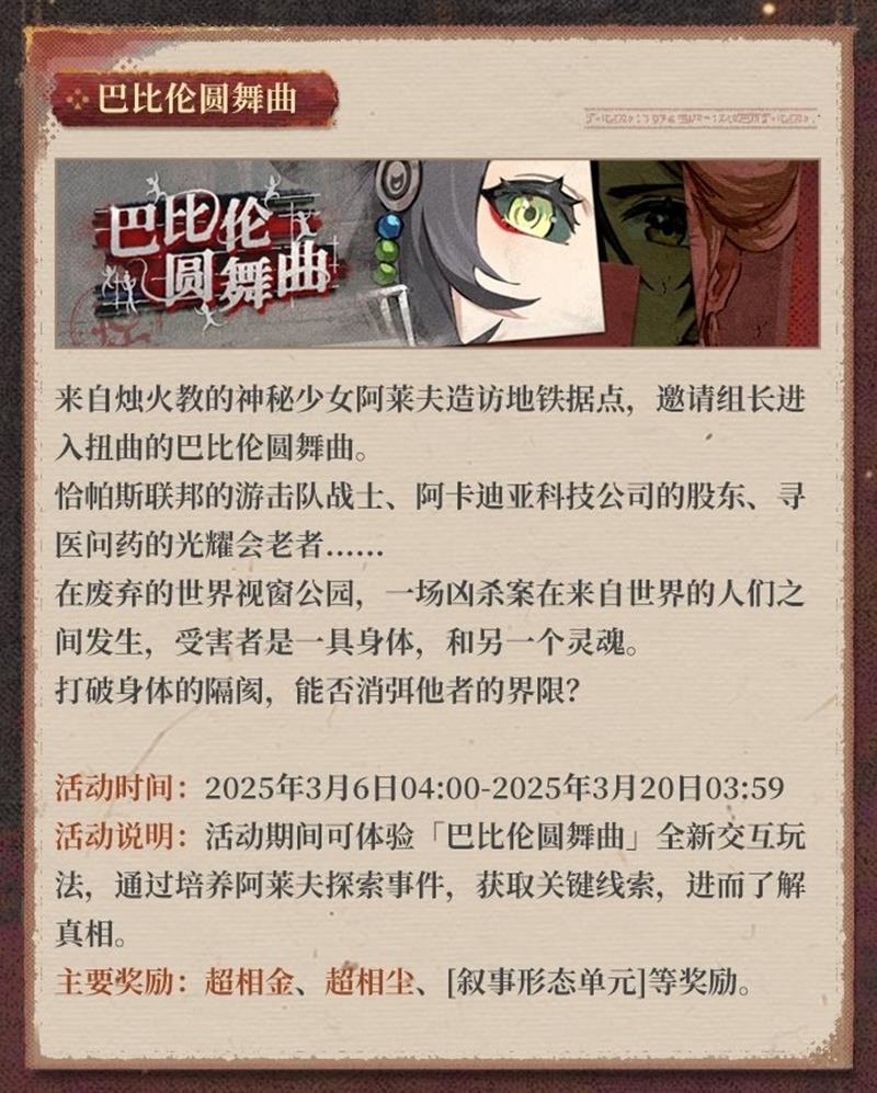 - 活动说明:活动期间可体验巴比伦圆舞曲全新交互玩法,通过培养阿莱夫探索事件,获取关键线索,进而解开谜题。