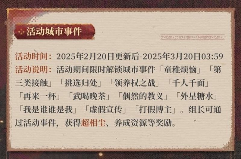 - 活动说明:活动期间限时解锁城市事件「童稚烦恼」「第一类接触」「挑选归处」「领养权之战」「千人千面」「再来一杯」「武喝晚茶」「偶然的教义」「外星糖水」「我是谁谁是我」「虚假宣传」「打假博主」等活动事件,获得超相尘、养成资源等奖励。