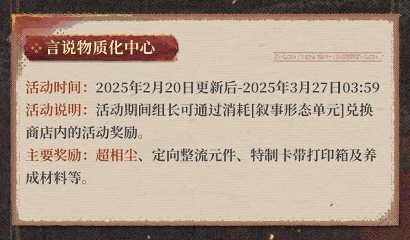 - 活动说明:活动期间组长可通过消耗【叙事形态单元】兑换店内的活动奖励。