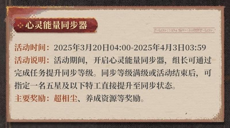 - 活动说明:活动期间,开启心灵能量同步器。组长可通过完成任务提升同步等级。同步等级满级或活动结束后,可指定一名五星及以下特工直接提升至同步状态。