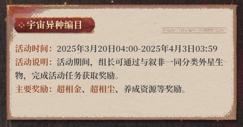- 活动说明:活动期间,组长可通过与叙非一同分类外星生物,完成活动任务获取奖励。