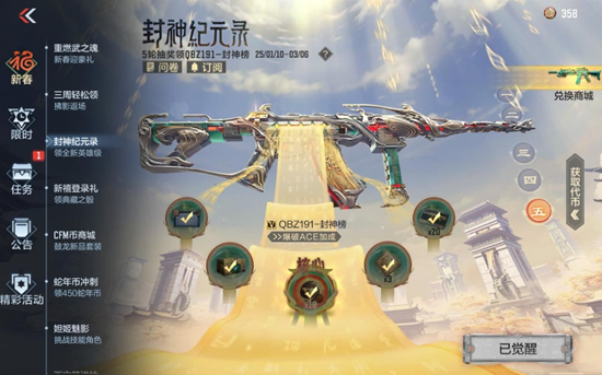 英雄级武器QBZ191-封神榜觉醒免费放送!只需轻松完成五轮抽奖任务,即可觉醒这款兼具炫酷外观与卓越性能的QBZ191-封神榜!它拥有爆破ACE专属加成,让你在战场上如虎添翼,所向无敌!此外,兑换商城中还有M4A1-黑龙-墨子、屠龙-星空等精美好礼等你来兑换,快来行动吧!
