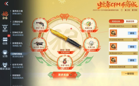 蛇年CFM币商城活动正在如火如荼地进行中!除了备受瞩目的鼓龙新品套装外,还有一把纯金打造的短刀——清刚-觉醒,也已经火热开启兑换。这把短刀不仅外观华丽,闪耀着金色的光芒,而且性能卓越,绝对是战场上的利器。另外,蛇年币冲刺活动也在持续进行中,只要参与活动,就有机会获得蛇年CFM币,大家快来抓住这个机会,尽情享受蛇年CFM币商城带来的福利吧!