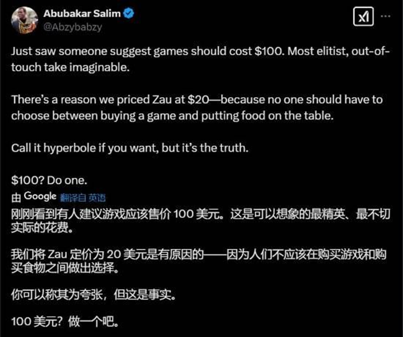 针对这种情况,在《刺客信条:起源》中为主角巴耶克献声的配音演员Abubakar Salim挺身而出。他发文反对不断上涨的游戏售价,给愿意花100美元买游戏的人贴上了“精英主义”的标签,并称他们与现实脱节。