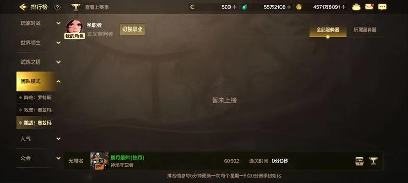 首次登录排行榜界面时,点击团队模式,选择挑战:奥兹玛,就能查看具体排名了。排行依据各职业通关挑战奥兹玛的时间进行排序。值得注意的是,q区和v区各自拥有独立榜单,而小区之间共享一个排行榜,同时也能查看本区排行榜。每5分钟更新一次排名信息,确保公平竞争。