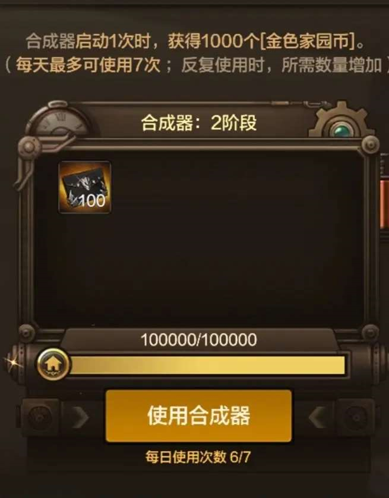 合成以后材料消失,获得金色家园币1000个,每天可合成7次,每次消耗材料依次增加,但家园币不增加。每天最多合成7次,累计可获得家园币7000个。