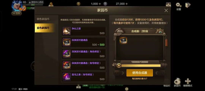 3、金色家园币合成次数每天重置,建议合成第一阶段,阶段成长消耗材料增加,但获得家园币不增加。