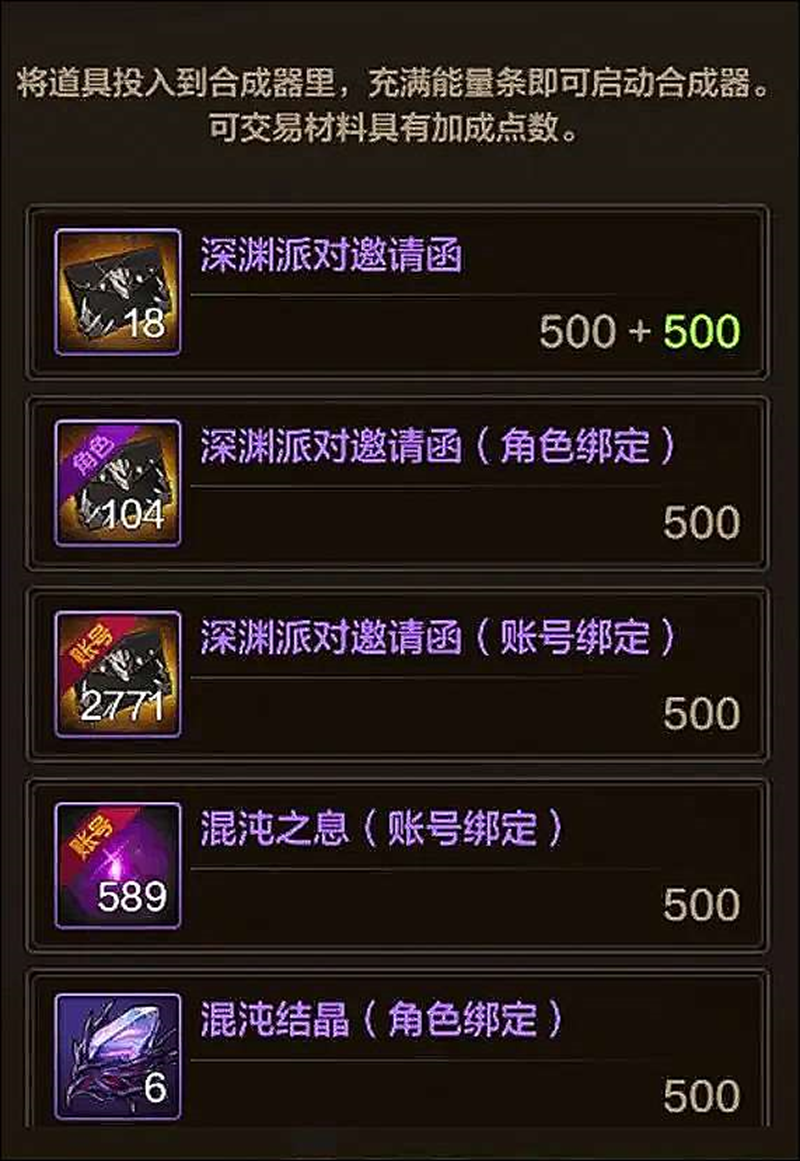 合成投入材料与游戏内材料互通,投入可交易材料时,额外获取能量点。