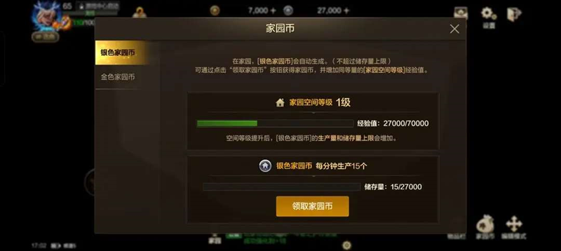 家园币分为银色家园币和金色家园币,银色家园币通过自动生成,每分钟生成15个家园币,1级家园累计可储存27000个家园币,累计30小时满储存。银色家园币生成不会超过储存上限,勇士们要记得领取。