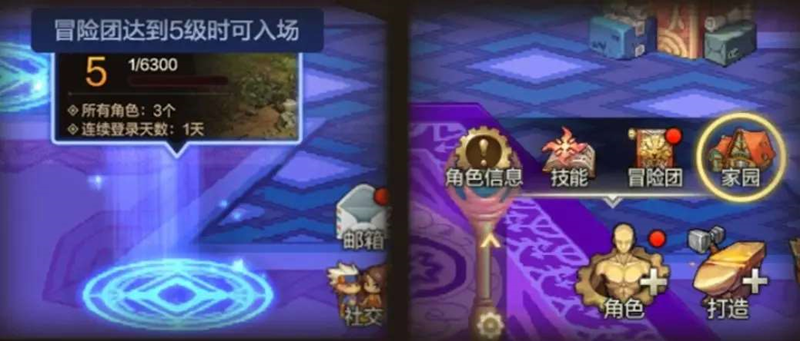新版本更新后,冒险团等级达到5级以上的玩家,可以解锁家园系统,通过主界面“角色”——“家园”进入家园系统。