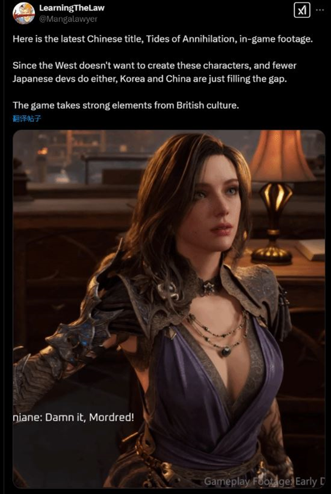 推特一游戏博主就转发了本作预告片中的女主截图,并称赞了游戏选题:“这款游戏吸收了浓厚的英国文化元素!由于西方不想创造这些角色,而日本的开发者也很少创造这些角色,因此韩国和中国正好填补了这一空白。”