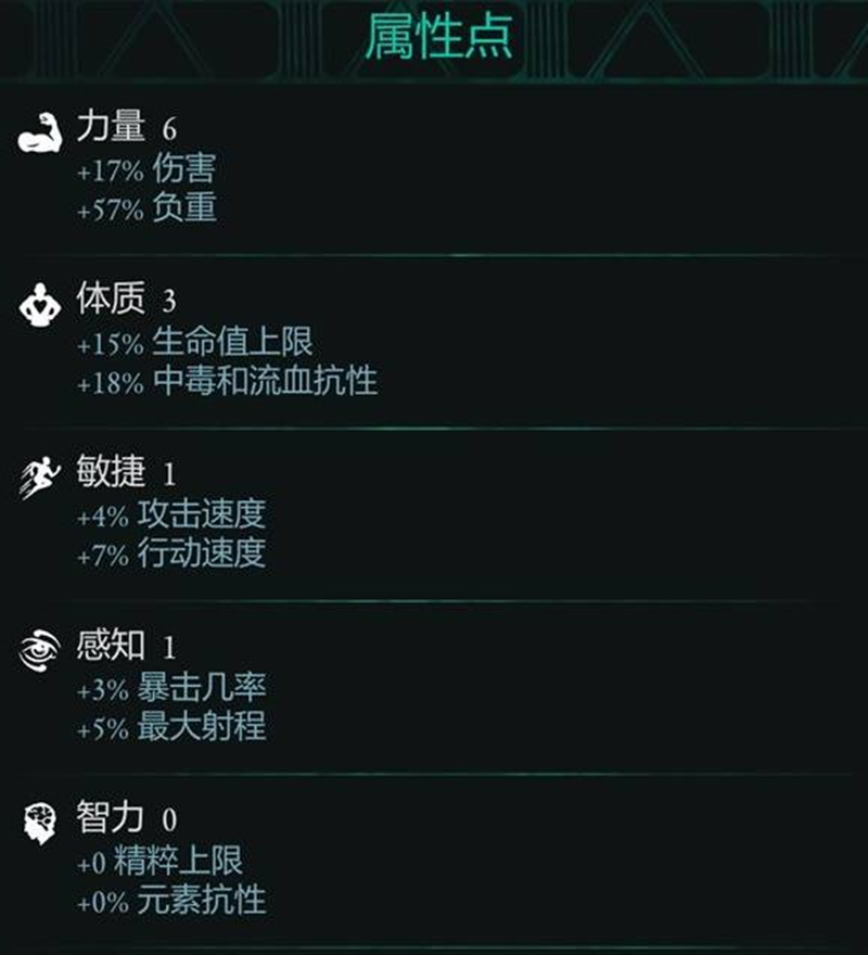 玩家角色的主要属性为力量、体质、敏捷、感知、智力和决心等六个维度。