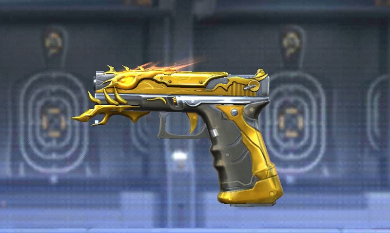 王者之迹GLOCK18-武圣的升级版,枪身外观由一层金黄色铠甲包裹,顶端符文的雕刻彰显出其神秘色彩。枪身上金色流光闪动,为其提供绵绵不断的力量。握把的设计让使用者有更强的握力来控制抖动的枪身,使其拥有极高的精准度和稳定性。