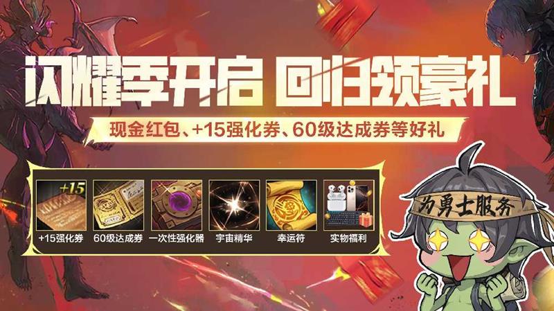 若14日未登录的勇士回家,活跃即可免费领50级全套史诗自选、+12武器强化券及大量养成资源,可作为装备过渡使用。