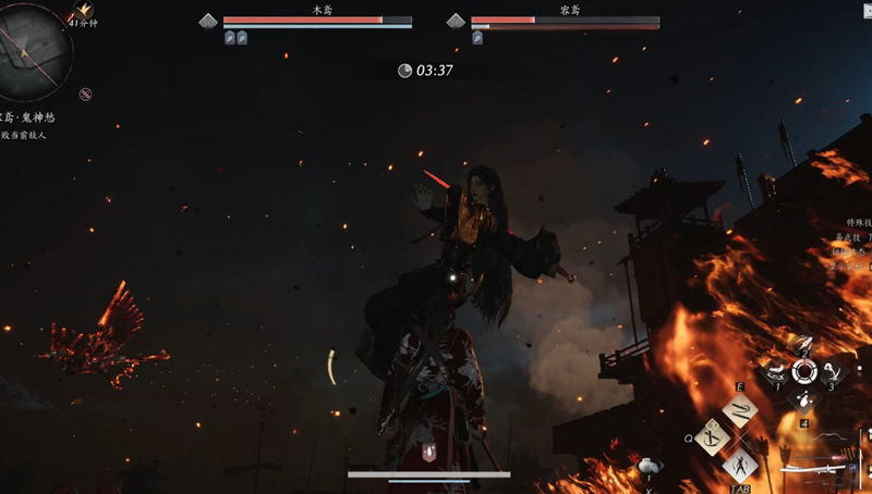 容鸢会召唤木鸢协助作战。木鸢的攻击虽多,但威胁不大,建议优先集中火力攻击容鸢。另外这时boss可以引爆炸药桶,此时需将BOSS拉到中间,全员搬桶,避免爆炸连锁。