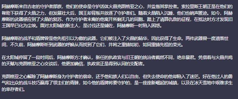 阿赫摩斯来自古老的守护者部族,他们的使命是守护活体火晶克图格亚之心,并监督其掌控者。索拉里斯王朝正是在他们的帮助下获得了火晶之力,但发展壮大后,国王却背叛并放逐了守护者们。随着火晶陷入沉睡,他们也销声匿迹。如今,阿赫摩斯的武器感应到了火晶的复苏,作为守护者末裔的他离开所剩无几的同胞,踏上了清算仇敌的征程,在抵达时方才发现旧王国早已化为尘埃。面对太阳城的新主人,是讨伐还是辅佐,阿赫摩斯一时陷入困惑。