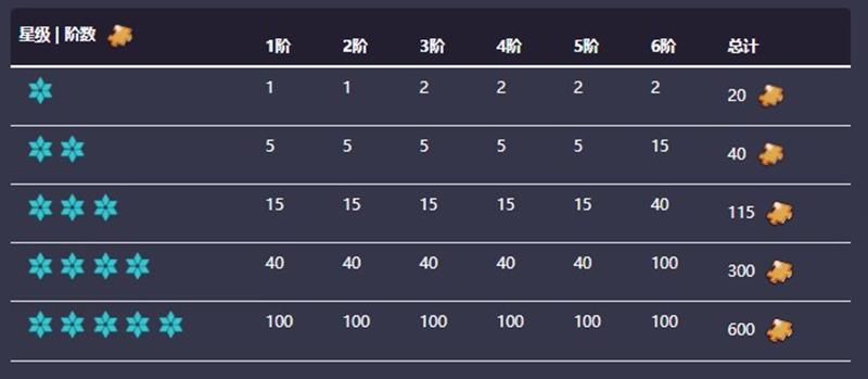 | 星级 | 阶数 | 1阶 | 2阶 | 3阶 | 4阶 | 5阶 | 6阶 | 总计 |