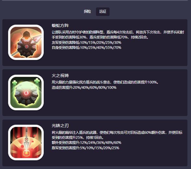 【蝮蛇方阵】让部队采用古时守护者的防御阵型,盾兵每4次攻击后,将放弃下次攻击,并使矛兵和射手受到的伤害降低30%,盾兵受到的伤害降低70%,持续2回合。友军受到伤害降低:10%/15%/20%/25%/30%;自身受到伤害降低:10%/25%/40%/55%/70%