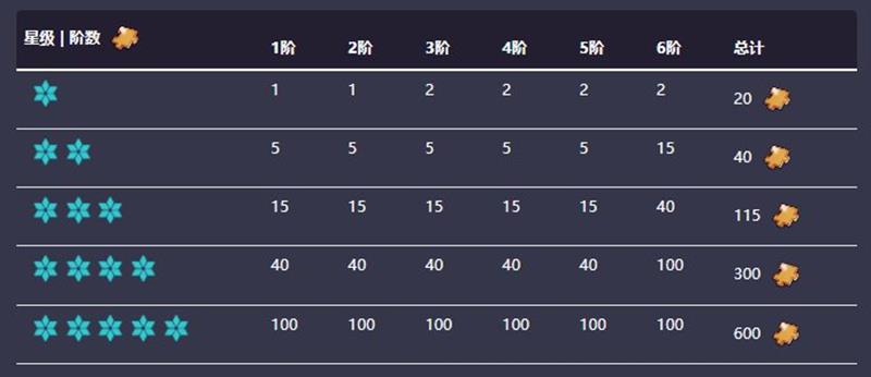 | 星级 | 阶数 | 1阶 | 2阶 | 3阶 | 4阶 | 5阶 | 6阶 | 总计 |