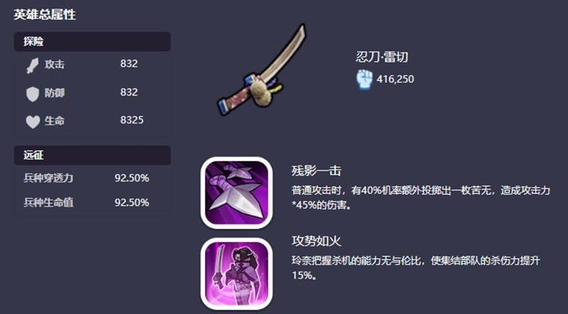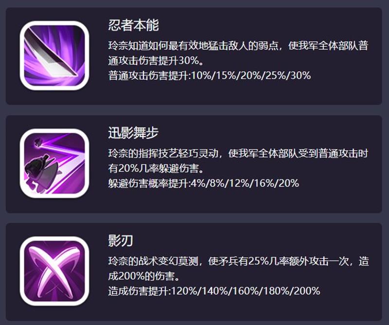 【忍者本能】玲奈知道如何最有效地猛击敌人的弱点,使我军全体部队普通攻击伤害提升30%。普通攻击伤害提升:10%/15%/20%/25%/30%
