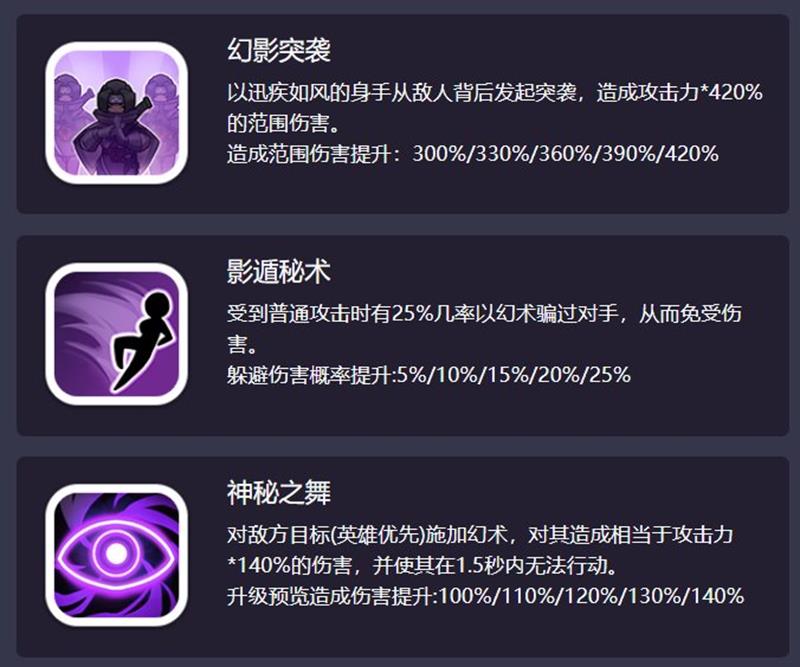 【幻影突袭】以迅疾如风的身手从敌人背后发起突袭,造成攻击力*420%的范围伤害。造成范围伤害提升:300%/330%/360%/390%/420%