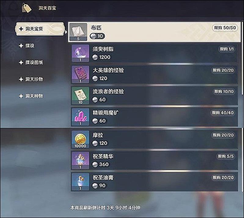 来到尘歌壶的阿圆商店,在这里可以用自动积攒的洞天宝钱进行这些材料的购置。